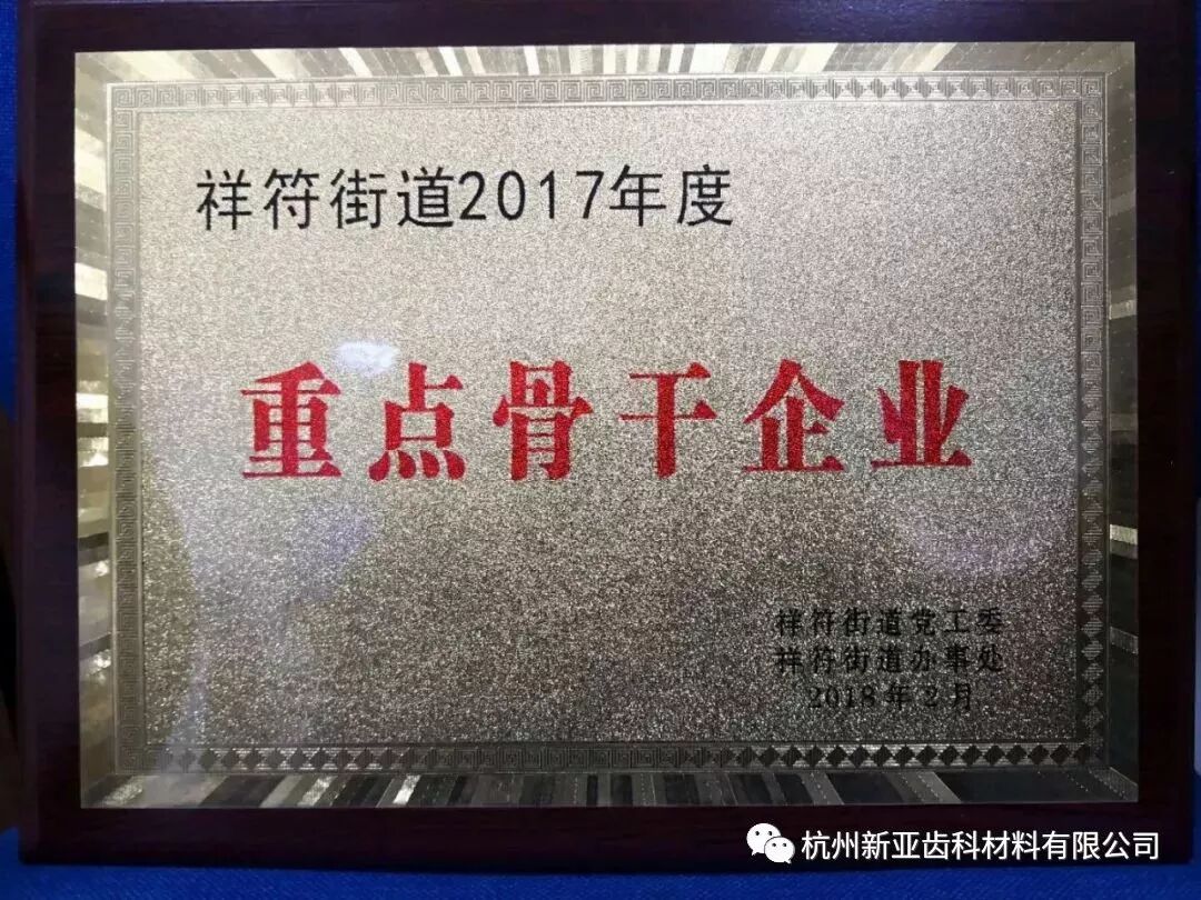 恭喜杭州新亚齿科材料有限公司荣膺祥符街道重点骨干企业称号